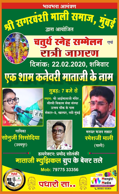 श्री सगरवंशी माली समाज, मुंबई द्वारा आयोजित चतुर्थ स्नेह सम्मेलन एवं रात्री जागरण का आयोजन 22 फरवरी 2020 शनिवार के दिन आयोजित होगा । जिसमे मुख्य रूप से राजस्थान की सुप्रसिद्ध भजन गायिका सोनु सिसोदिया एवं मरुधर भजन सम्राट रमेश माली एक शाम कनेवरी माताजी के नाम रात्री जागरण में  विशेष भजनों की प्रस्तुति देंगे।