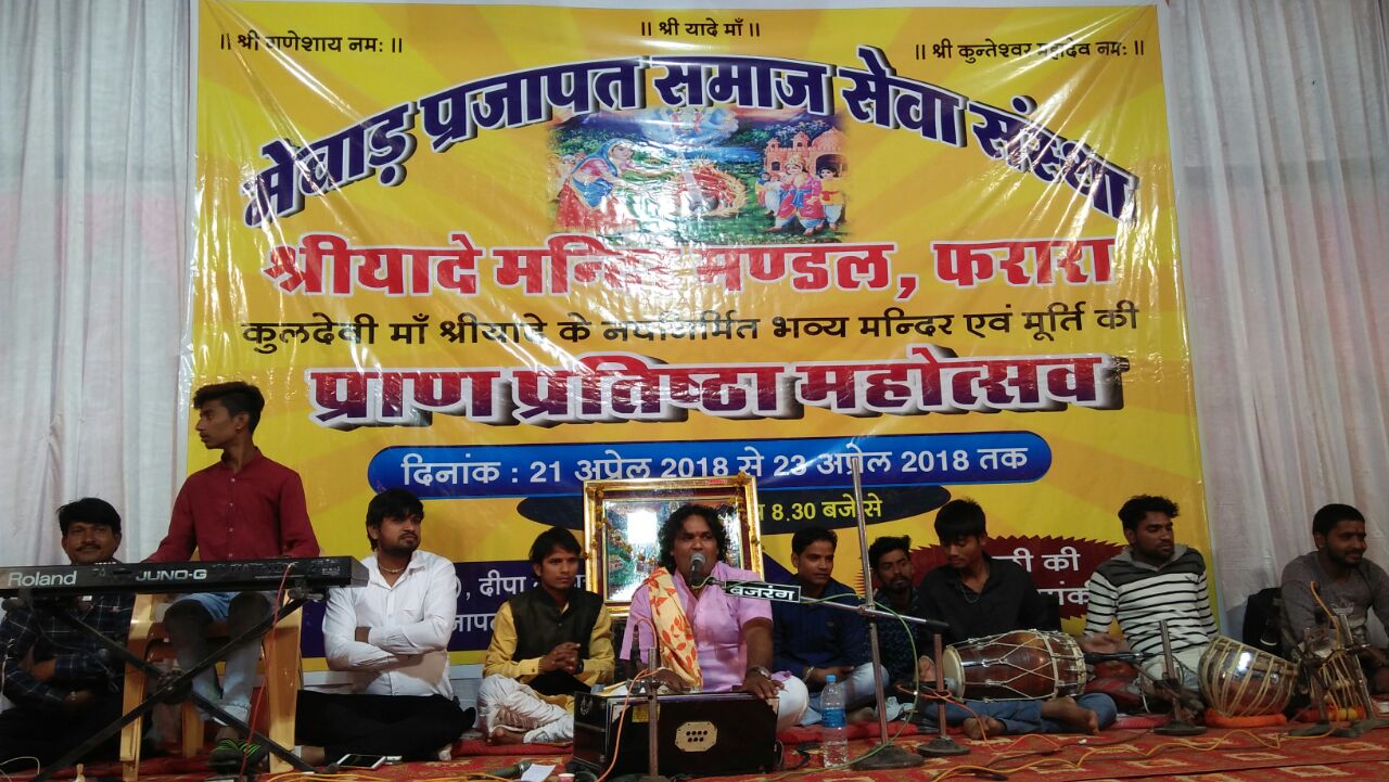 राजसमंद = फरारा महादेव में मेवाड़ प्रजापत समाज सेवा संस्था मंदिर मंडल फरारा (चौखला) के तत्वाधान में समाज की कुलदेवी मां श्रीयादे के नवनिर्मित मंदिर पर आयोजित तीन दिवसीय धार्मिक महोत्सव के प्रथम दिन कई कार्यक्रम के दौरान द्वितीय दिन एक शाम मां श्री श्रीयादे के नाम विशाल भजन संध्या का आयोजन किया गया जिसमें भरत प्रजापत एंड पार्टी के बैनर तले मोहित राज बिलाडा, दीपा दाधीच भीलवाड़ा, गायक मोहित राज बिलाडा ने गणपति वंदना के साथ अपने भजनों की शुरुआत की।  भजनों की मनमोहक प्रस्तुतियां दी। व भजनों की स्वर लहरियों पर श्रोता झूमने पर मजबूर होने लगे।