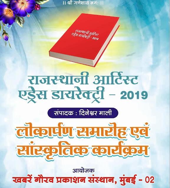 मुम्बई। कवि और उदघोषक दिनेश्वर माली द्वारा संपादित राजस्थान के कलाकारों की पहली आर्टिस्ट एड्रेस डायरेक्ट्री का लोकार्पण समारोह मार्च महिने में सम्पन्न होगा। जिसमें टीवी सीरियल, फ़िल्म, बॉलीवुड से जुड़ी राजस्थान की दिग्गज हस्तियां शिरकत करेगी। मुम्बई में होने वाले इस कार्यक्रम में रंगारंग राजस्थानी सांस्कृतिक कार्यक्रम का आयोजन भी होगा।